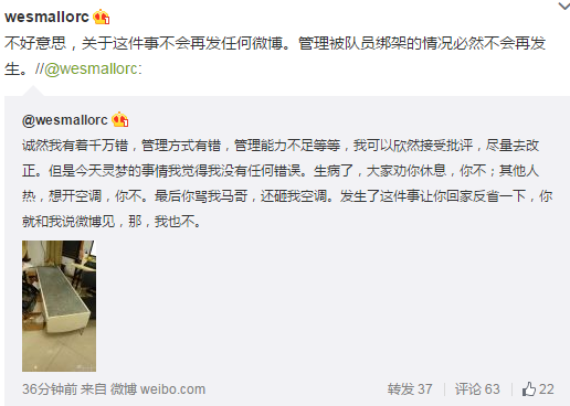 不好意思,关于这件事不会再发任何微博。管理被队员绑架的情况必然不会再发生。"