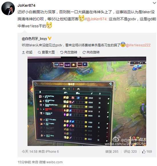 还好小白截图功力深厚,否则就一口大锅盖在韦神头上了,这事姑且认为是Faker没搞清楚韦神的ID,等S5让他知道厉害。