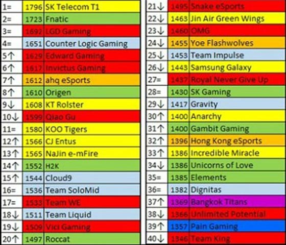 LCS赛区:欧美赛区方面,Fnatic同样凭借在LCS.EU的强大统治力稳坐第二。而Origen的进榜我们也不感到意外,毕竟这支队伍刚拿到一张S5总决赛的入场券,而且展示出了除Fnatic外强大的实力,排名第8实至名归。北美方面排名最高的为北美一号种子CLG战队,他们在北美赛区展现出了强大统治力。传统强队C9与TSM则分列第15、16名。