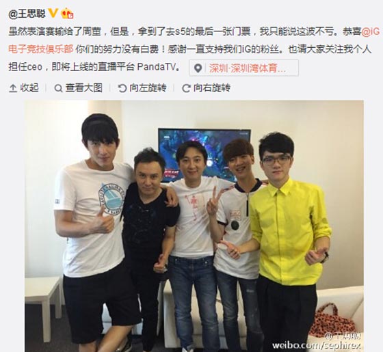 随着IG成功晋级S5世界总决赛,“全民老公”王思聪也避免了之前允诺的“吃翔”尴尬。他在赛后第一时间问候队员“大家辛苦了”,表示虽然表演赛输给了周杰伦战队,但是拿到中国区最后一张晋级S5的门票,这波还是不亏的。最后王校长还确认了由他担任CEO的全新直播平台——Panda TV即将上线。