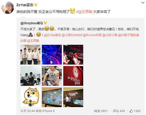 IG上单姿态随后在微博表示,别的我不管,反正老公不用吃翔了。