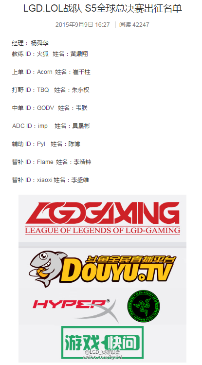 LGD出征S5总决赛阵容:Flame与小熙替补。