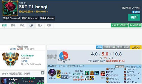 但是Faker确实是最勤奋的一个,目前SKT的所有队员中,只有Faker和Marin再打排位,其他的像打野的Bengi,下路的Bang和wolf都还没有开始排位。也难怪SKT现在的Carry点是上单和中单,勤奋努力的人总是会有回报的。