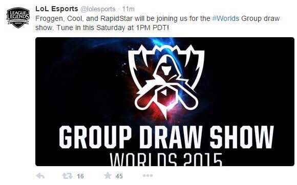 而今日Riot正式公布将由Froggen、cool、RapidStar三人参加2015总决赛的分组抽签仪式,时间定为美国太平洋时间九月十二日下午一点(北京十三日凌晨四点)。