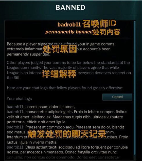 到目前为止,改过卡是通过邮件发送给违反召唤师守则的玩家的。现在他们会在客户端内出现,传递惩罚的内容,并展现触发触发的聊天记录。推送改造卡到客户端会确保玩家一定会收到他们受到惩罚的原因,了解他们为何被处罚,并且从而改善自己的问题。因为大部分玩家可能一般不会收到我们的改造卡,以下是一个实例: