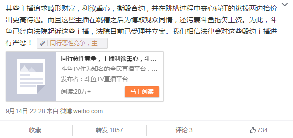 昨晚22时28分,斗鱼官微发布名为“同行恶性竞争,主播利欲熏心,斗鱼TV正式向法院起诉”一文。