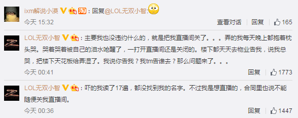 值得注意的是小智也在下面进行了评论!主要我也没违约什么的,就是把我直播间关了。。。弄的我每天晚上都抱着枕头哭。哭着哭着被自己的泪水呛醒了,一打开直播间还是关闭的。楼下都天天去物业告我,说我总哭,把楼下天花板给弄湿了。我说你告我?我tm告谁去?那么问题来了。。。吓的我读了17遍,都没找到我的名字。不过我是想直播的,合同里也说不能随便关我直播间。