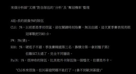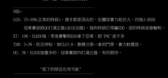 然后就是分析各小组的出现情况,A组和B组都是3支队伍争两个名额,一个相对较弱的队伍很有可能搅局,C组和D组的形势都较明朗,很可能是中韩携手出线。叉烧认为闪电狼和AHQ的签运都很好,有可能进8强,但是很难进4强,因为中韩的队伍实在是太强了。
