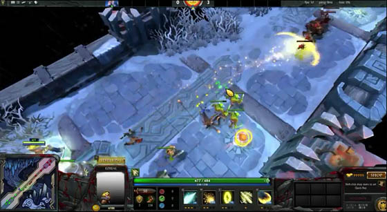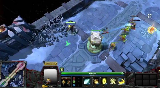 从截图中我们可以看到,整个游戏UI采用的是刀塔2的界面,界面顶部中间是时间与双方阵容以及比分信息,左下方是地图,地图右边是召唤师的动态头像。不过由于英雄联盟没有敏捷智力等加点,所以属性一栏为零,接着就是技能展示了,相应的加点我们也可以通过技能下方的小黄点看出来。界面右下则是装备栏。