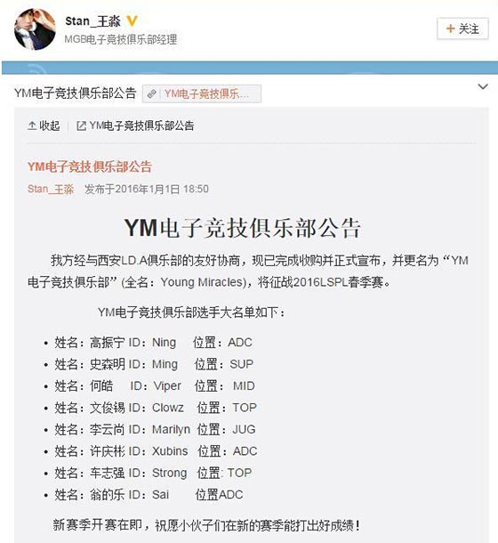 不过事情又有了转机,1月1日,MGB经理宣布收购LD.A俱乐部,MGB战队重生为YM战队,并将征战2016LSPL。