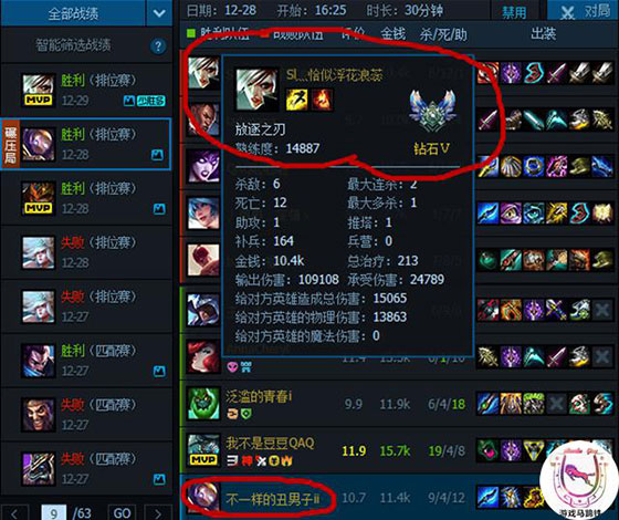 首先该玩家是黑色玫瑰的钻石组,而在他的战绩中我们可以得知,截止去年的12月28日他在排位中遇到的人依然都是钻石分段的玩家,如下图: