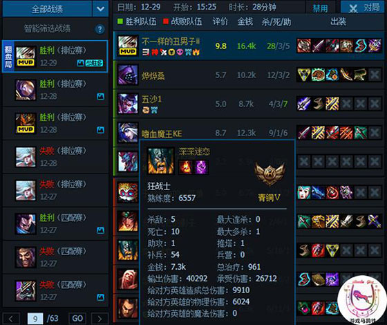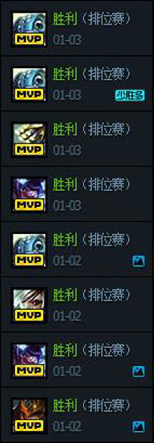 把把MVP,把把屠杀局,青铜的玩家也真是“X了狗了”,不过也有人提出会不会是双排?但是根据所有战绩来看,没有同一个人是超过两局的,因此不太可能是带青铜双排。哪怕是每一局都换一个人,也不可能只拍到青铜。再说能够找到65个青铜的玩家双排也真是不容易的事情吧...