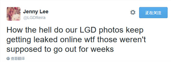而LGD的海外经理Reira也表示对定妆照被泄露一事表示十分的愤怒,她写道:我们LGD原来还有一周多时间才会发布的定妆照为什么现在TMD传的到处到是?