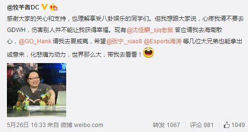 在老党和沐沐正式宣布恋人关系后,DC老师再一次处于风暴中心。各方水友和职业圈众人纷纷声援DC,并大喊口号GTMDDWH。而DC作为当事人,也终于在26日发微博称:“感谢大家的关心和支持,但是请不要再GDWH了,伤害别人并不能让我幸福。”并表示希望职业圈的友人可以拿出实际行动来心疼他,小8海涛双双中枪。