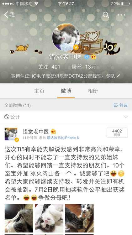 6月28日晚,iG领队错觉(老中医)在微博上确认了自己受邀成为TI5中文解说。为了庆祝自己受邀,他决定在微博上豪ROLL冰火肉山以及至宝庆祝。