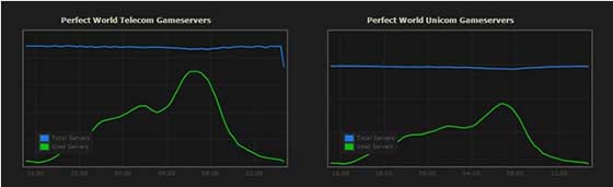 在DOTA2大陆地区的运营工作中,最重要的内容即包括了为国内用户提供充足与稳定的服务器,保证各位玩家的游戏体验。随着游戏用户数量的不断增加,我们也在源源不断地补充游戏服务器,确保用户在匹配到游戏后不需要再寻找是否有空余的游戏服务器,并直接进入比赛。如下图所示,蓝色代表了我们电信与联通服务器的总数,而绿线代表了已经被使用的游戏服务器数量,目前我们尚有充足的空余游戏服务器以承载更多用户。