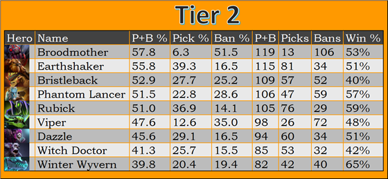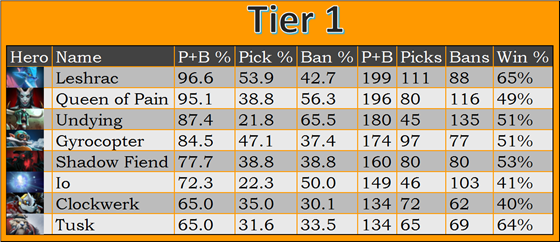 本文整理了在6月间206场职业比赛中的BP结果,在本月中拉席克、女王、尸王、飞机几乎成为非Ban即选的角色,巨牙海民也登上了第一档次英雄的榜单。