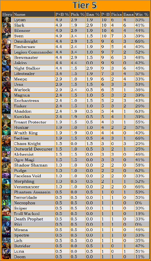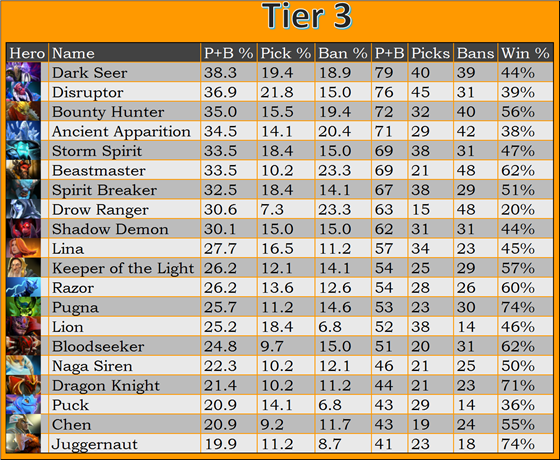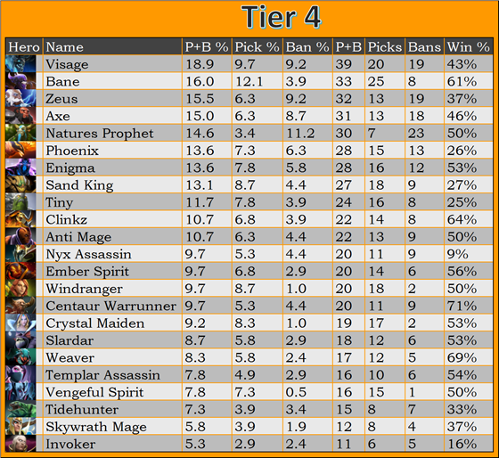 第三档次:干扰者、光法、电魂、瘟疫法师、血魔、小那家、帕克、主宰较上月出场次数增多;凤凰、宙斯、复仇之魂出场率下降。