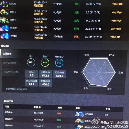 近日,某著名DOTA2第三方数据网站提供了玩家们比赛记录的雷达图。B神在查询自己雷达图发现近乎完美后,赶忙在微博上秀了起来。