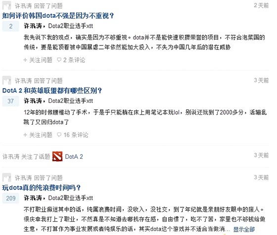 HGT战队的队员XTT(许汛涛)被水友挖出在知乎上一系列有关DOTA的言论,XTT回答了许多有关DOTA2这个游戏的评价以及关于HGT战队的问题。