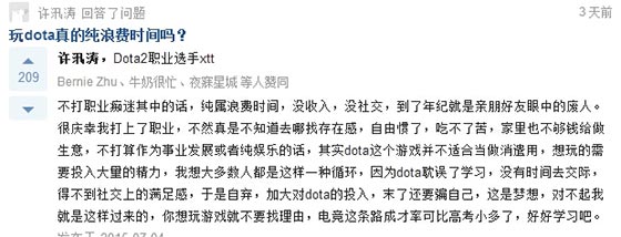 XTT谈打职业的一段话更是发自肺腑:“不打职业痴迷其中的话,纯属浪费时间,没收入,没社交,到了年纪就是亲朋好友眼中的废人。很庆幸我打上了职业,不然真是不知道去哪找存在感,自由惯了,吃不了苦,家里也不够钱给做生意,不打算作为事业发展或者纯娱乐的话,其实dota这个游戏并不适合当做消遣用,想玩的需要投入大量的精力,我想大多数人都是这样一种循环,因为dota耽误了学习,没有时间去交际,得不到社交上的满足感,于是自弃,加大对dota的投入,末了还要骗自己,这是梦想,对不起我就是这样过来的,你想玩游戏就不要找理由,电竞这条路成才率可比高考小多了,好好学习吧。”