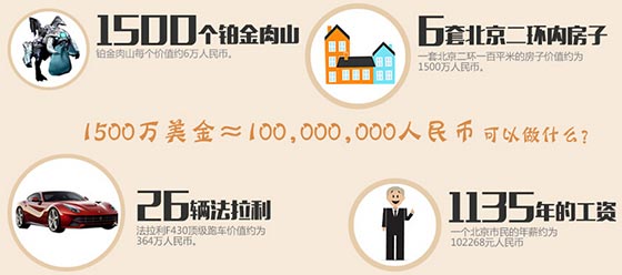 1500万美金,或许冷冰冰的数字并不能让你觉得有多震撼,但是如果换算成我们身边的物品单位,这样的数字是庞大的。