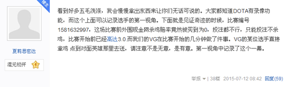 一位ID为“夏莉思密达”的水友在贴吧发帖称VG.P涉嫌假赛。“我们都知道所有的DOTA2现金网都是用的是188的赔率,然而在1个小时之内,VG P独赢的赔率从0.3直升到1.3.为什么会赔率这样变呢?因为这1个小时内有大笔资金(起码上10万才有可能让赔率这样变)买VG.P输,除了VG.P的队员跟管理层能控制比赛,还有谁会这样。”对于赛前赔率的巨大变化,夏莉思密达产生了质疑。