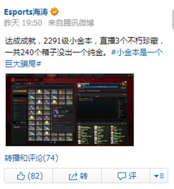 TI5总奖金已经突破1600万刀,这自然离不开大家对小金本的等级购买支持。圈内知名解说海涛近日微博称,自己的小金本等级已经超过2200级,然而依旧没有开出纯金不朽……真可谓是最“冤大头”玩家。