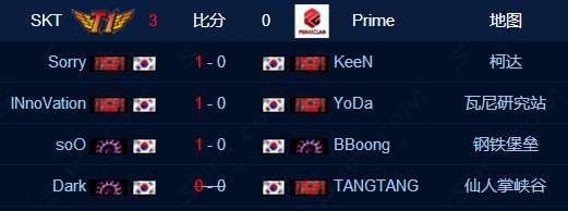 作为卫冕冠军,SKT第四轮开场就表现出了良好的状态。甚至不用Dark上场,soO、卫星哥和Sorry就直接把Prime打趴下了。第三轮SPL期间,中国选手Jim等人曾短暂加入Prime征战SPL,但只有Jim登场过一次且输掉比赛。第三轮SPL中Prime就成绩垫底,本轮开局不利,看来成绩依然堪忧