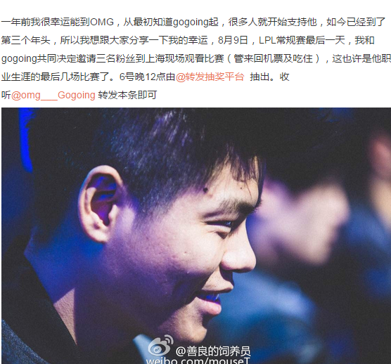 一年前我很幸运能到OMG,从最初知道gogoing起,很多人就开始支持他,如今已经到了第三个年头,所以我想跟大家分享一下我的幸运,8月9日,LPL常规赛最后一天,我和gogoing共同决定邀请三名粉丝到上海现场观看比赛(管来回机票及吃住),这也许是他职业生涯的最后几场比赛了。6号晚12点由@转发抽奖平台 抽出。收听@omg___Gogoing 转发本条即可