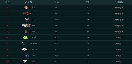 8月13日2015LCK夏季常规赛正式落下帷幕,季后赛将于8月16日正式打响。以下为2015LCK夏季常规赛积分排行情况.