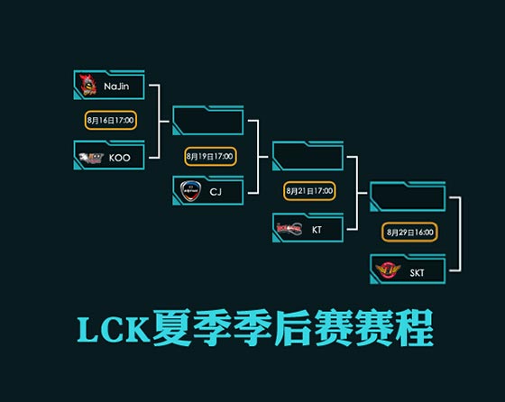 LCK季后赛将于8月16日17:00开战,同LPL一样采用冒泡淘汰赛制。具体赛程如下表: