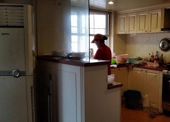 在最大的房间当中,一共布置了12台电脑,队员的大多数练习时间都在这里度过。我刚到基地的时候,打野选手Swift以及两名替补选手分别坐在自己的电脑之前,而其他的选手全部外出了。从练习室出来,我们看到了队伍的厨房,煮饭阿姨正在为他们准备食物。
