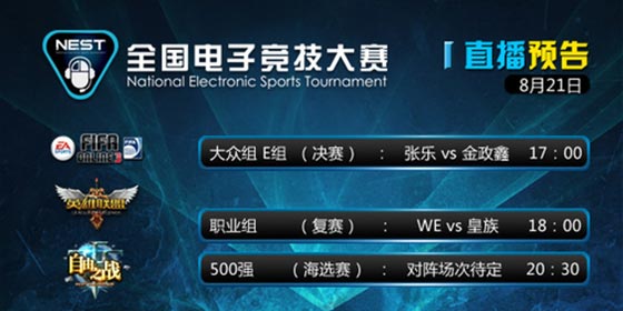 NEST2015全国电子竞技大赛预选赛进入第十五比赛日,FIFA Online3即将迎来E组最终的决战,英雄联盟职业组的对抗也越来越激烈,表演项目自由之战的500强海选赛也正在从20000多支参赛队中开始选拔。