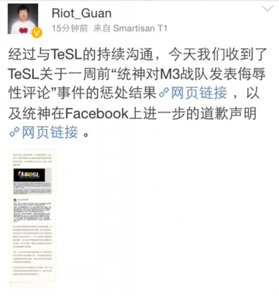 在8月11日M3对阵OMG的比赛中,台湾解说统神由于在解说过程中语言过激找到了部分玩家的反对,而M3俱乐部也要求其作出郑重道歉,此事件在经过Riot与TeSL的协商后,今日公布了对统神的处罚,而统神本人也再次在其Facebook上做出了道歉。