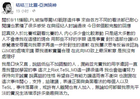 认真投入于比赛或观看比赛的人内心多少会比较激动,只是绝大多数的人不会像我在这样的场合用那些不好的字眼,这是事实,对于这部分让M3感觉遭受辱骂向我要求再进一步针对性的道歉,在我屡次思考反省后认为以M3的处境来讲要我道歉实属合理,在此向M3致上最深歉意是,我没有处理好。