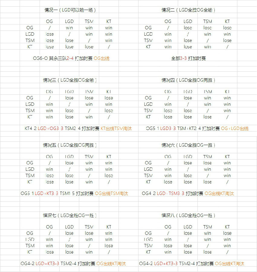 4,LGD三场全胜,只有一种可能性可以直接出线:KT三战全负,OG除了LGD全赢,TSM除了KT全输。