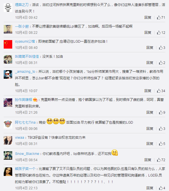 然而LGD的粉丝们似乎并不买账,还是对队伍的BP、教练组非常不满: