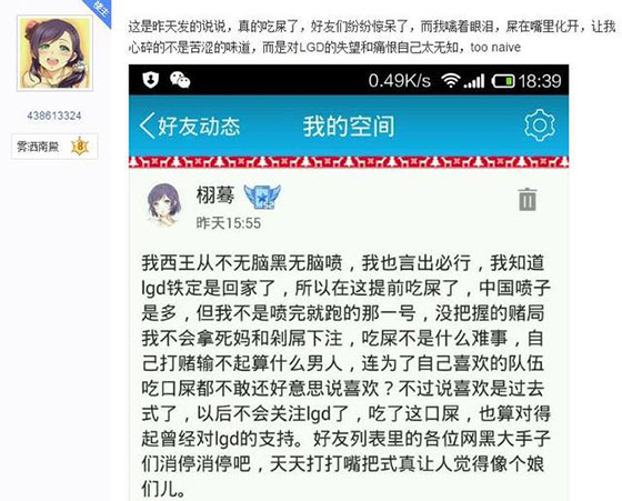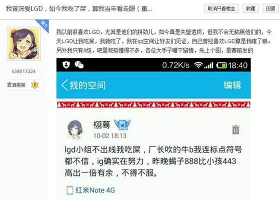原文:我以前很喜欢LGD,尤其是他们的拼劲儿,如今真是失望透顶,但我不会无脑黑他们的,今天LGD让我吃屎,我就吃了,我在qq空间让好友们见证,自己曾经喜欢LGD算是我瞎了眼。另外我只有8级,吧里规矩懂得不多,各位大手子嘴下留情,先上个图,是赛前发的。