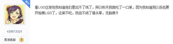 楼主:看LGD这尿性我知道他们是出不了线了,所以昨天我就吃了一口屎,因为我知道我以后也要开始黑LGD了,这屎不吃,我岂不成了墙头草,无脑黑?