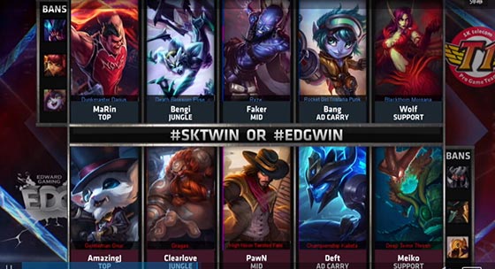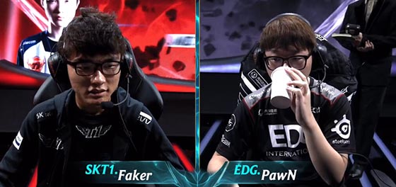 比赛开始后,SKT打野蜘蛛两次来到上路配合Marin的诺手塔下强杀EDG.AJ的纳尔。SKT在上路成功打开突破口之后,诺手发育无解肥。本场比赛Faker的状态也非常好,有一波中路一套技能完美单杀Pawn卡牌的精彩表现。在取得局面优势后,SKT节奏紧凑的抱团推塔拿龙,EDG丝毫没有任何办法阻挡。