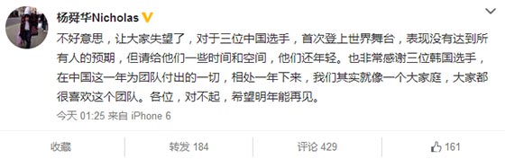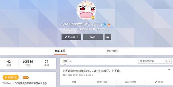 在今日LGD负于KT无缘S5小组出线之后,韦神和PLY第一时间微博发声,均表示了对支持他们的粉丝的歉意。