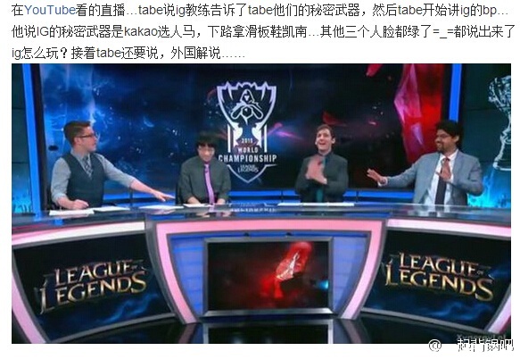 Tabe在登上欧美解说台后,解说的时候竟然透露了iG的“秘密武器”:打野人马,下路是滑板鞋和凯南……还想爆料的时候被其他三人及时制止。