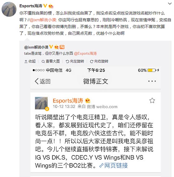 最近Tabe在S5直播间泄露IG大招一事引发大家广泛关注,LOL圈多位知名“大V”均纷纷表示愤怒和谴责。很快,DOTA2知名解说海涛也发表微博对此事进行了评论,并称Tabe为“电竞汪精卫”。