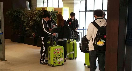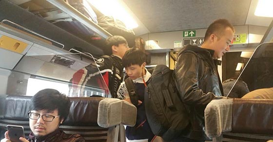 这次我们这百来号人的行李都非常多,带上这列欧洲之星显然有点困难,最后,在大家互相帮忙之下,总算是上了车,把行李都安置好。就在大家刚坐下的时候,爱萝莉来到了我们车厢,手里拿着炸鸡。“这是我鸡翅,我们还有可乐,哈哈!”说罢,他把一盒鸡翅当上了行李架,便开始和翻译打闹了起来。爱萝莉的出现让我们车厢的气氛一下子都活跃了起来,大家都笑了。