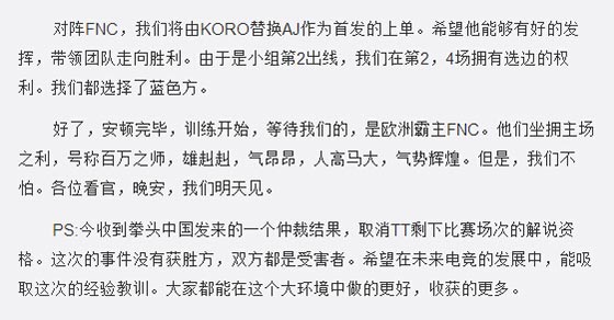 今天三少照常每日发布了S5战地日记,在文中除了透露Koro1将在对阵FNC的八强战中首发登场之外,还有一个消息值得关注,那就是EDG收到了拳头中国发来的仲裁解说,TT被取消剩余场次的解说资格。