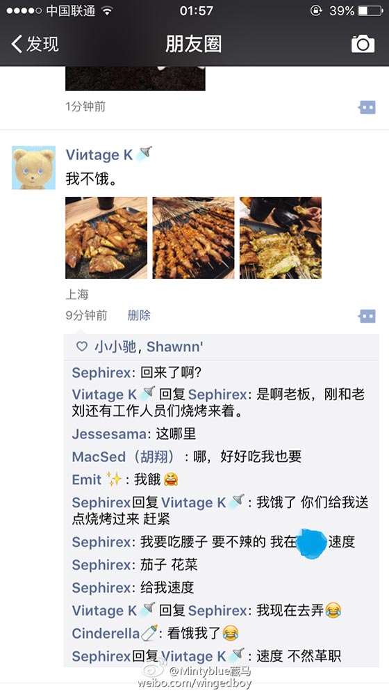 去Dota2分让super选一个喜欢的信使,顺便发个微博说”信使已到位,以后不用iG信使扣工资“。开黑搞一把爆爆爆,回来乖乖睡觉,计划简直完美。正准备出门,回想起今天烧烤体验还算可以,不禁有点坏坏的想法:把刚才烧烤的图片放几张到朋友圈,配字:我不饿。一时兴起也同时发了个微博(想必大家也看到了,就是上一条)然后我蹦蹦跳跳去开黑了。