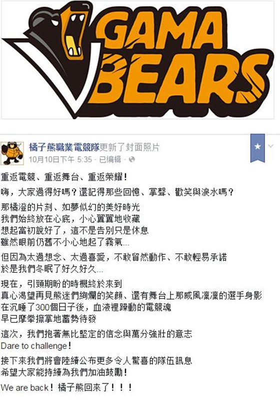 曾在星际争霸2项目创下佳绩的橘子熊在2014年12月12日时宣布将暂时封印。此次正式宣布重返电竞、重返舞台、重返荣耀,值得大家关注。