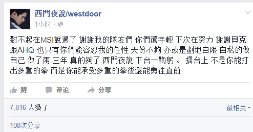 “對不起在MSI說過了 謝謝我的隊友們 你們還年輕 下次在努力 謝謝貝克跟AHQ 也只有你們能容忍我的任性 天份不夠 亦或是劃地自限 自私的做自己 做了兩 三年 真的夠了 西門夜說 下台一鞫躬 。 擂台上 不是你能打出多重的拳 而是你能承受多重的拳後還能勇往直前”