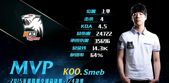 赛后MVP自然给到了KOO的上单剑姬,这也是Smeb在KOO取胜的两场比赛中连续两次获得MVP。
